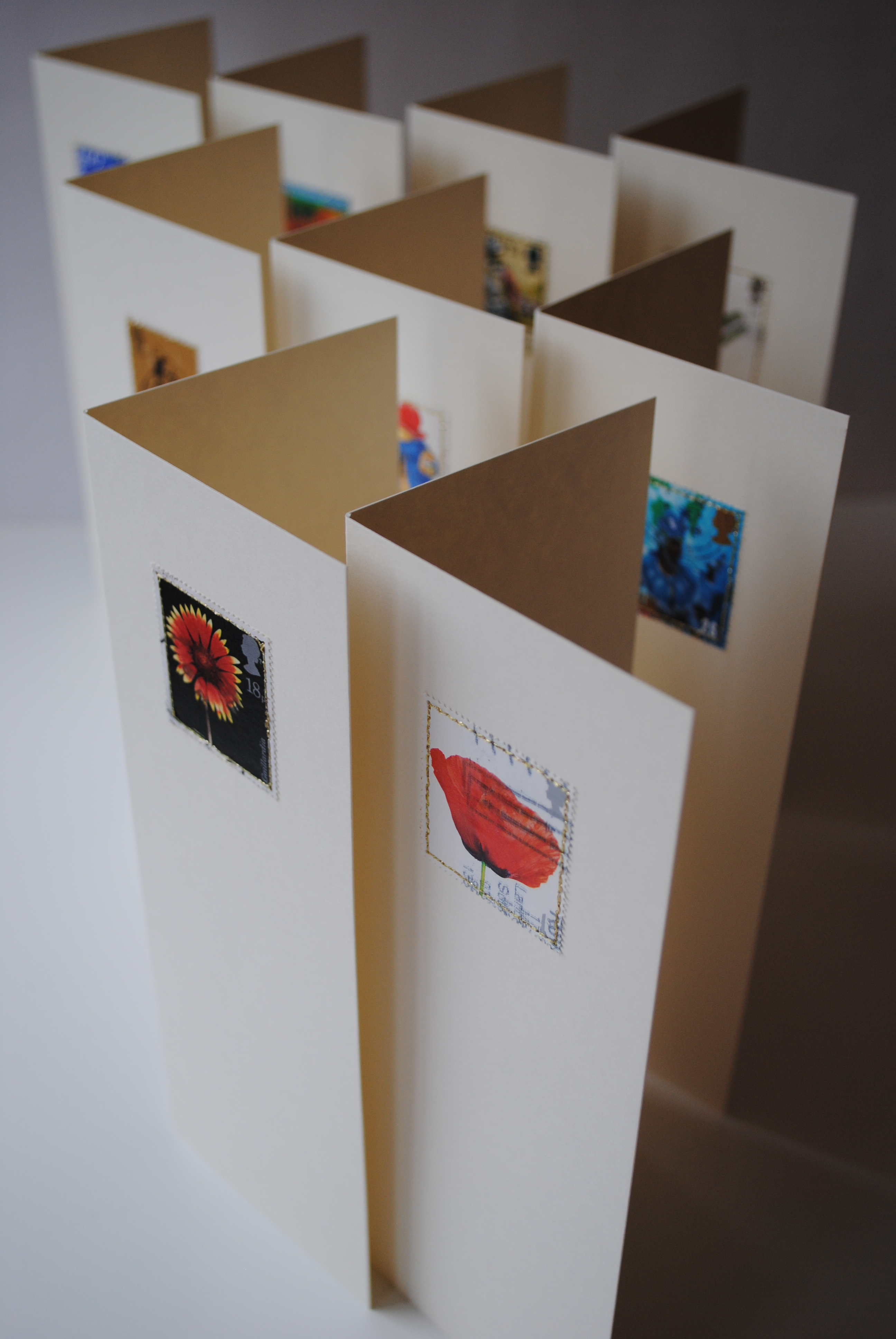 Postage stamps sewn on to greetings cards